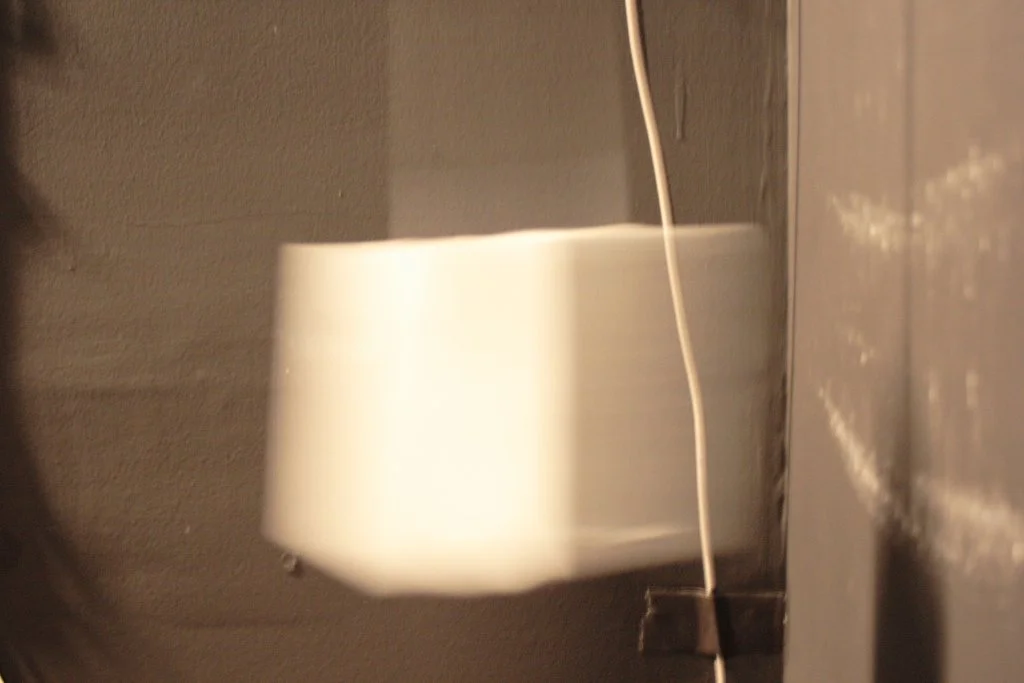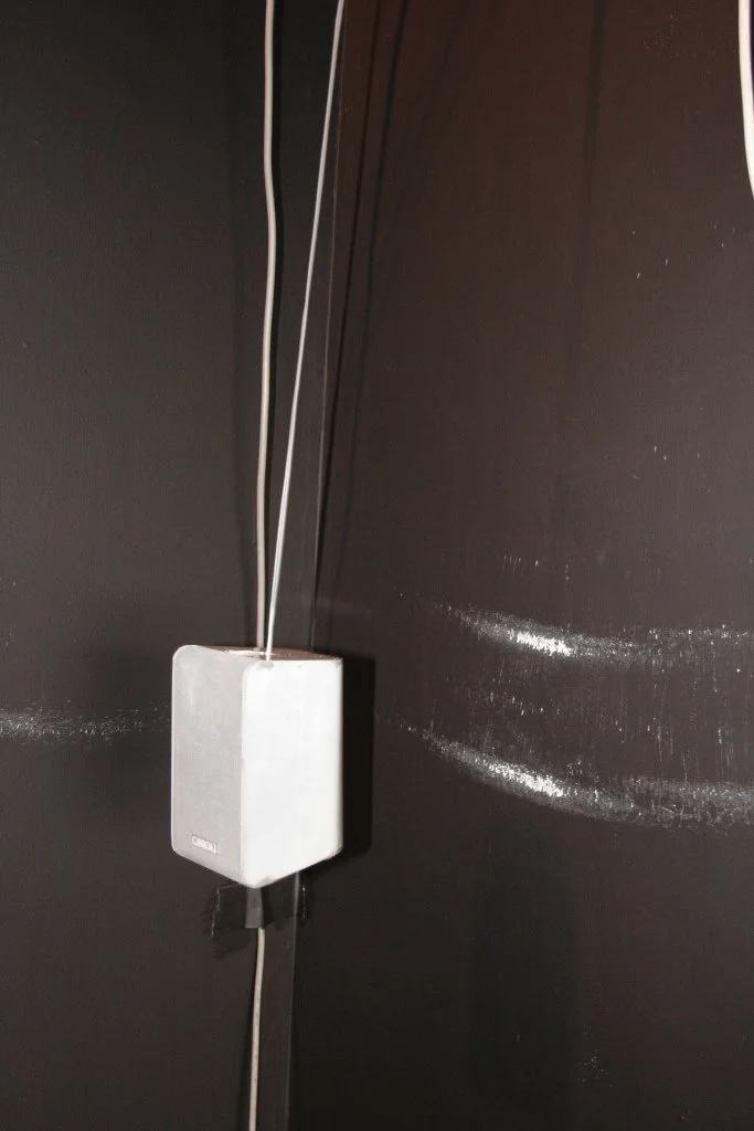 Meanwhile, the speaker, kind of heavy, unstable, slightly unpredictable - hit the corner of the gallery wall with every swing. A dull, repetitive thud that made me laugh. It reminded me - probably too literally - of a head (likely mine) banging against the wall in despair. Thud. Thud. Thud.