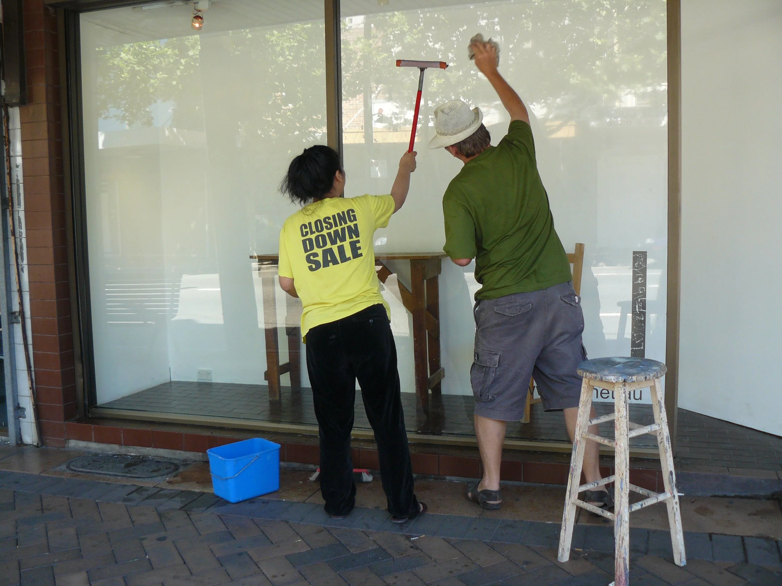 Cleaning the windows and installing the work at Slot Projects Alexandria w/ Tony Twigg