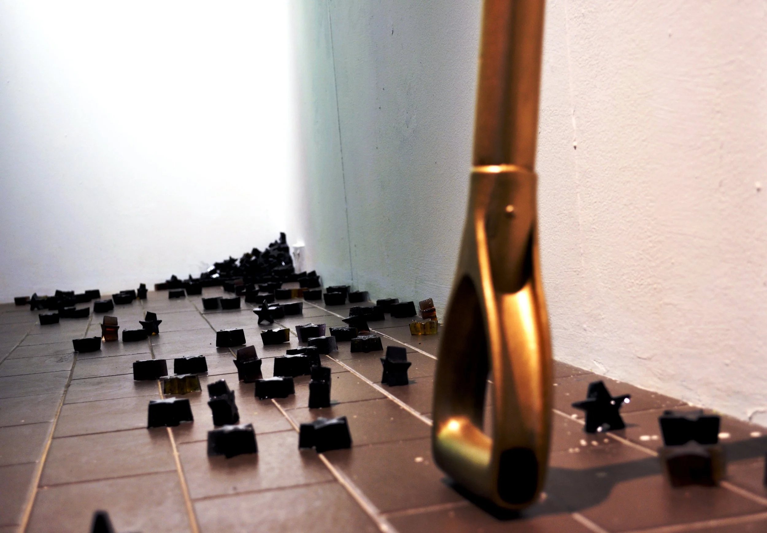 I cast small stars from semi-translucent resin using IKEA ice moulds I had lying around at home, at the kitchen table, after meals. I could only make a small batch at a time. It was a slow process. I think I wanted to make a truckload, to fill the floor completely at SLOT- to have the shopfront glass act like an aquarium with the stars piled up, like a dark waterline. But it was winter, and I had the flu. So I gathered what I was able to make and once at SLOT, scattered them across the floor. Like fallen dreams, party remnants, or dead satellites. I bought a shovel from the hardware store and spray-painted it gold. I wasn’t sure why - to collect the stars? To bury them? A garish attempt to look slightly less arte povera? I wasn’t even sure if the shovel belonged in the piece. But there it was anyway.