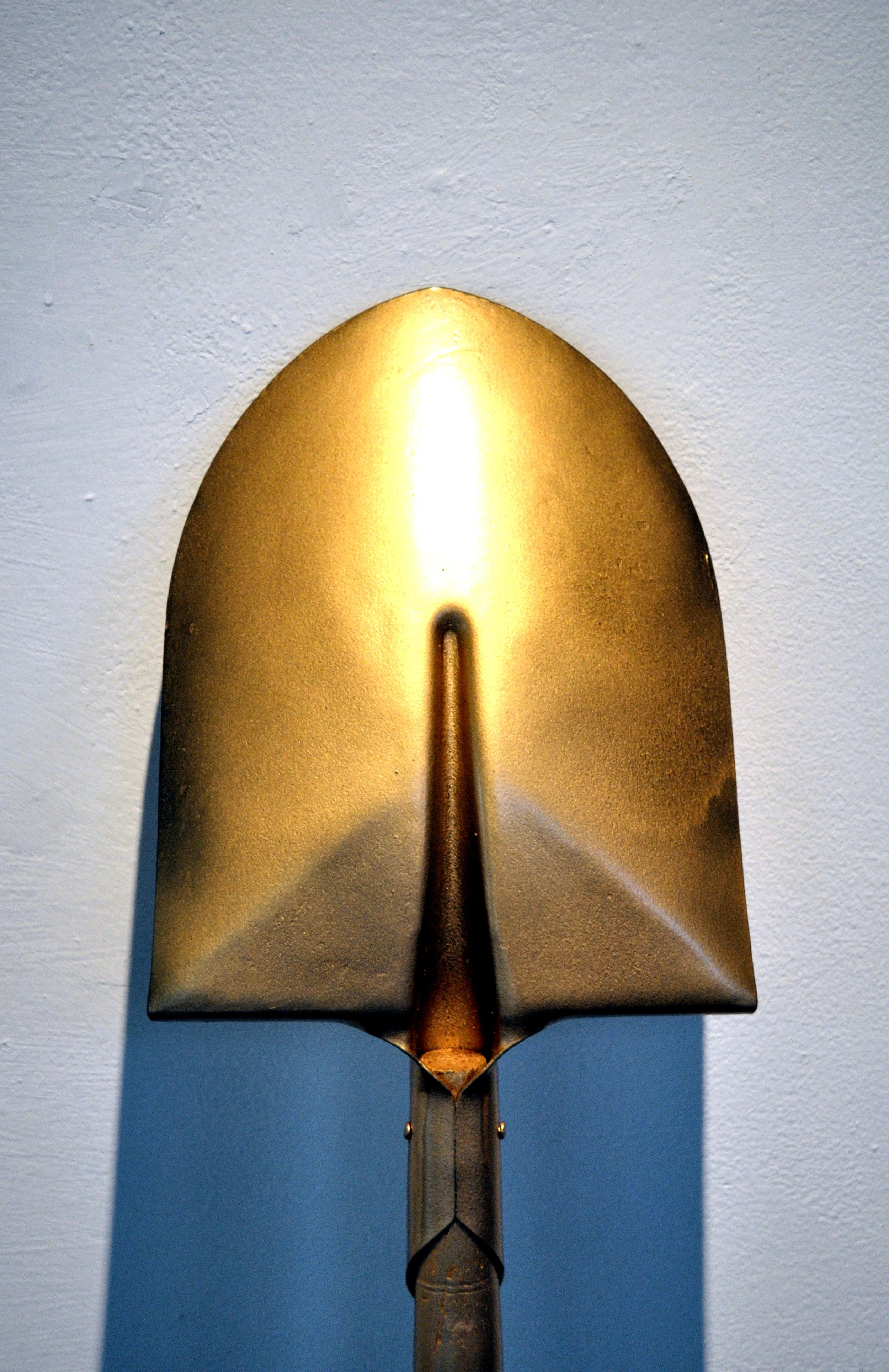 Tools and implements have their own art history. Duchamp’s snow shovel (In Advance of the Broken Arm) turned one into an absurd gesture - all form, no function. Joseph Beuys used tools as relics of healing and revolution. David Medalla once stuck knives on a wall - not to wound, but what I read as a kind of psychic self-defence through art. My shovel is spray-painted gold. It looks heavy with something, but it doesn’t do anything. It just dully sparkles, like a wallflower in a corner.