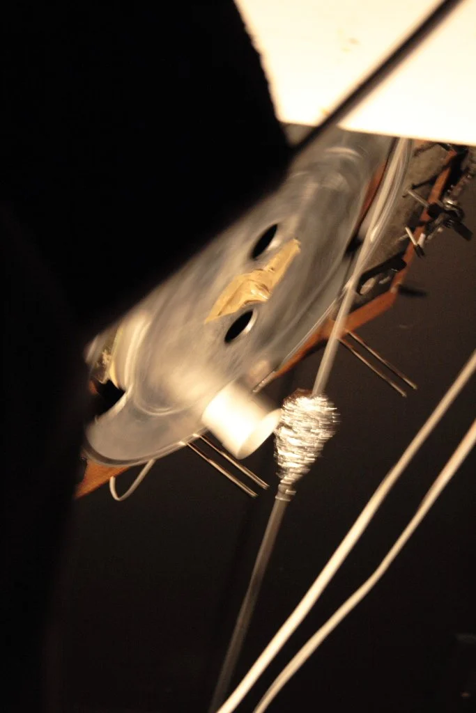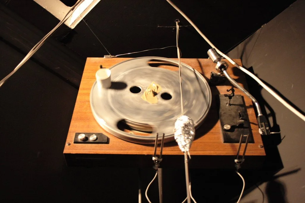 Kinetic Sound Installation (lost) Tuning forks, open circuit, 2x sound piece on 2x cd, cd players, turntable, aluminium foil, speakers, pendulum (lost)